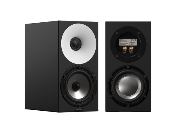 The device is a two-way, passive radiator with a 25 mm titanium tweeter and a 12 cm aluminum mid/woofer, with a 1600 Hz crossover point,  8 Ω impedance, 84 dB sensitivity, and 5 kg weight.